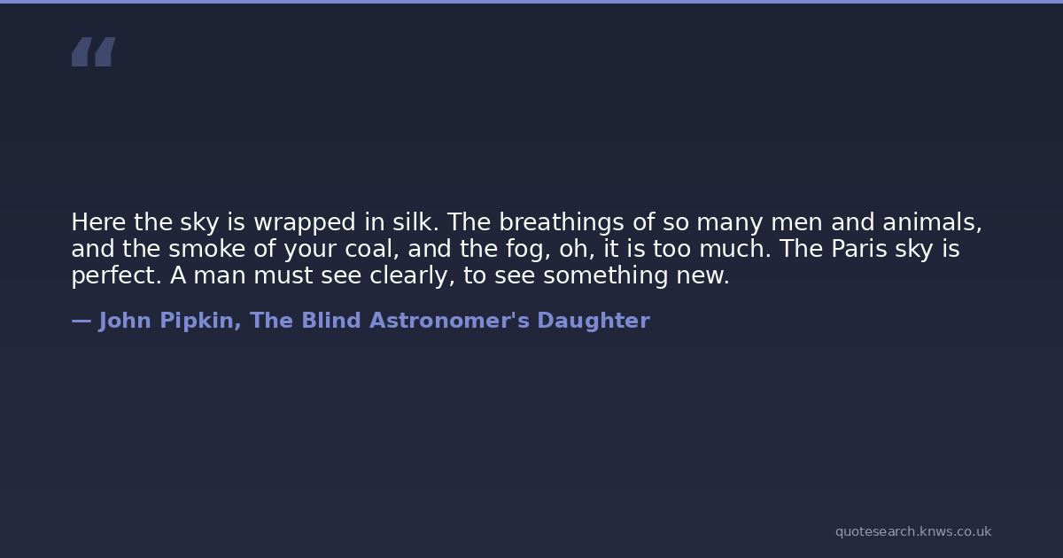 Here the sky is wrapped in silk. The breathings of so many men and animals, and the smoke of your coal, and the fog, oh, it is too much. The Paris sky is perfect. A man must see clearly, to see something new.