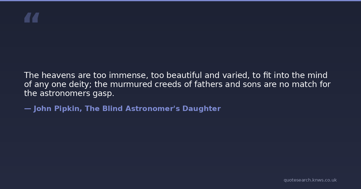 The heavens are too immense, too beautiful and varied, to fit into the mind of any one deity; the murmured creeds of fathers and sons are no match for the astronomers gasp.