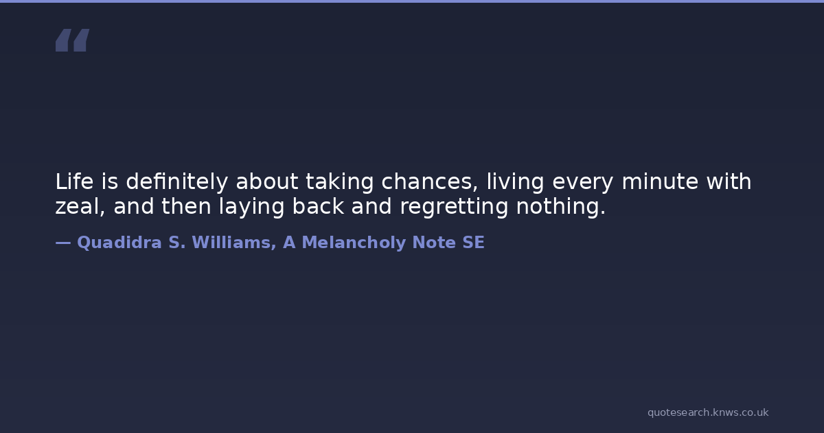 Life is definitely about taking chances, living every minute with zeal, and then laying back and regretting nothing. domestic-violence fiction romance Download Image Share on X Share on Facebook Copy Link