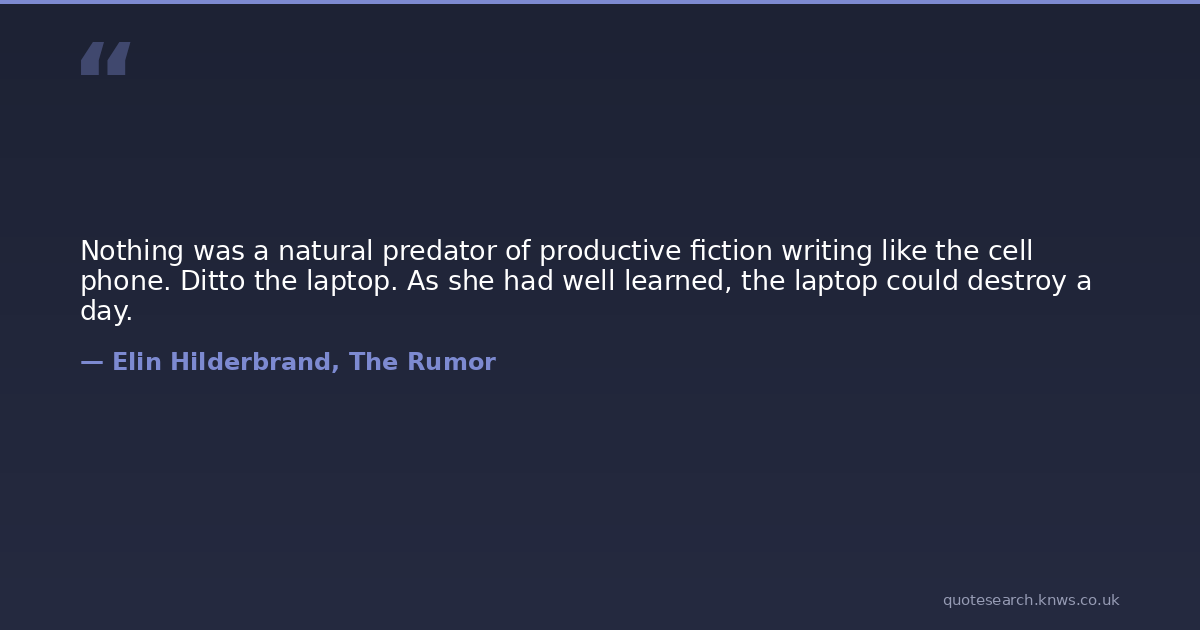 Nothing was a natural predator of productive fiction writing like the cell phone. Ditto the laptop. As she had well learned, the laptop could destroy a day.