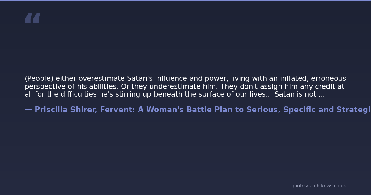 (People) either overestimate Satan's influence and power, living with an inflated, erroneous perspective of his abilities. Or they underestimate him. They don't assign him any credit at all for the difficulties he's stirring up beneath the surface of our lives... Satan is not God. And he is not God's counterpart or peer... Satan is nothing but a copycat trying desperately to convince you he's more powerful than he actually is... So even though he's given temporary clearance to strategize and antagonize, we don't need to pray from a position of fear or weakness against him... But we can't expect to experience this power unless we're serious about joining the battle in prayer.