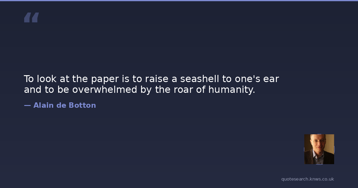 Alain de Botton was a contemporary British author. Alain de Botton is a Swiss-born British author and public speaker. His books discuss various contemporary subjects and themes, emphasizing philosophy's relevance to everyday life. Read more on Wikipedia →