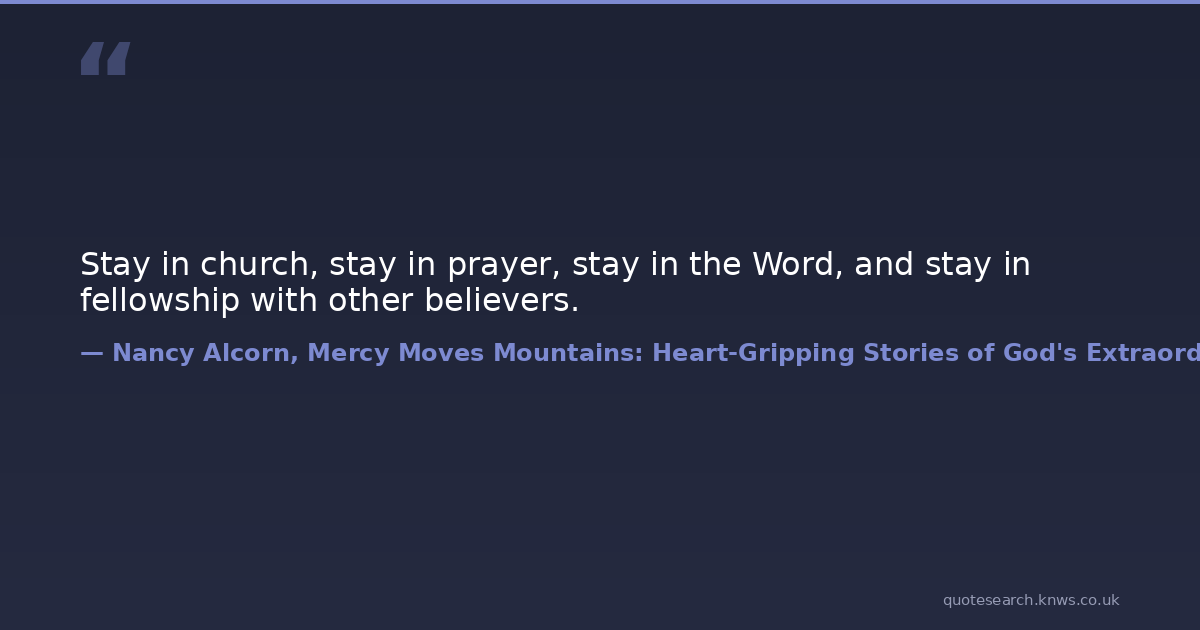 Stay in church, stay in prayer, stay in the Word, and stay in fellowship with other believers. believers church fellowship prayer Download Image Share on X Share on Facebook Copy Link