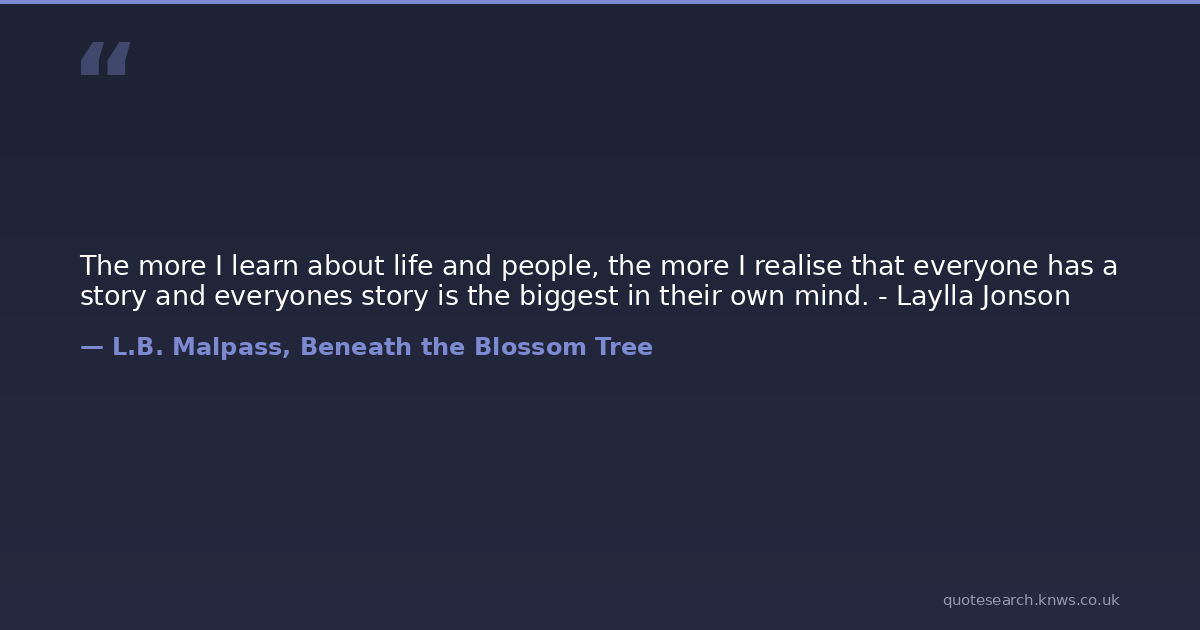 The more I learn about life and people, the more I realise that everyone has a story and everyones story is the biggest in their own mind. - Laylla Jonson