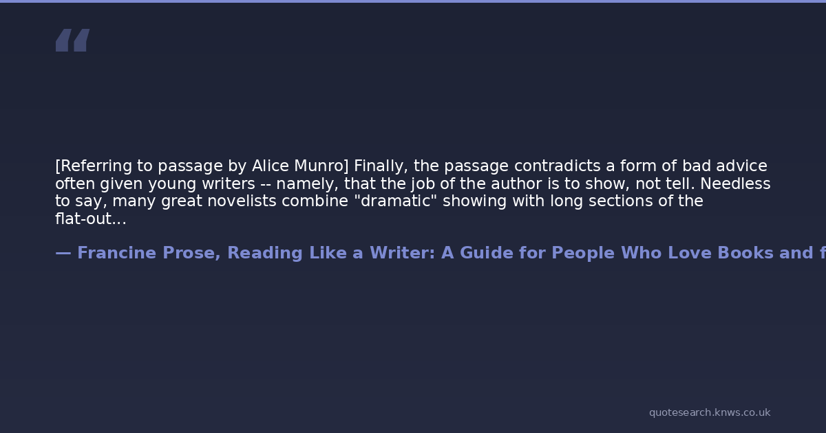 [Referring to passage by Alice Munro] Finally, the passage contradicts a form of bad advice often given young writers -- namely, that the job of the author is to show, not tell. Needless to say, many great novelists combine "dramatic" showing with long sections of the flat-out authorial narration that is, I guess, what is meant by telling. And the warning against telling leads to a confusion that causes novice writers to think that everything should be acted out -- don't tell us a character is happy, show us how she screams "yay" and jumps up and down for joy -- when in fact the responsibility of showing should be assumed by the energetic and specific use of language.