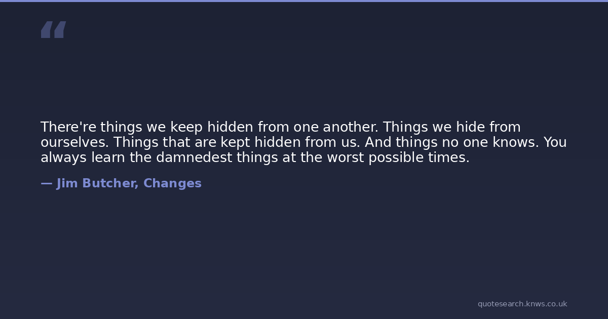 There're things we keep hidden from one another. Things we hide from ourselves. Things that are kept hidden from us. And things no one knows. You always learn the damnedest things at the worst possible times.