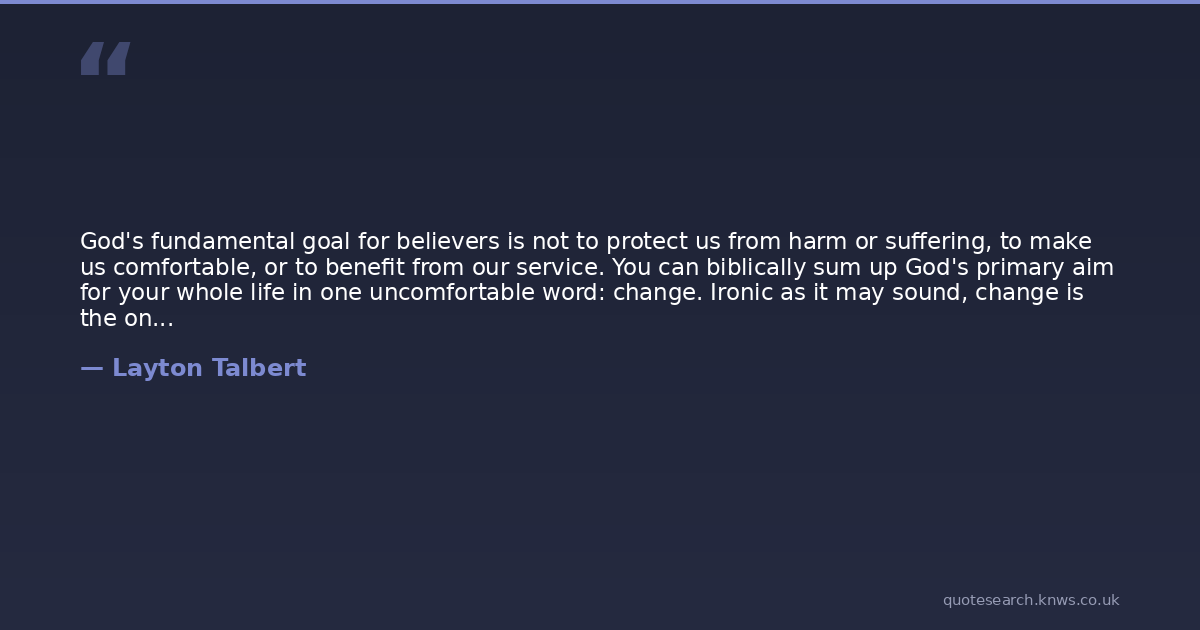 God's fundamental goal for believers is not to protect us from harm or suffering, to make us comfortable, or to benefit from our service. You can biblically sum up God's primary aim for your whole life in one uncomfortable word: change. Ironic as it may sound, change is the one constant that God purposes for every believer, regardless of circumstances - whether you are in ministry or in a secular job, married or single, healthy or handicapped, chronically ill or terminally diseased. God's immediate and ongoing purpose for every Christian in time and on earth is to change us, to make us like Himself, to conform us to the image of His Son.