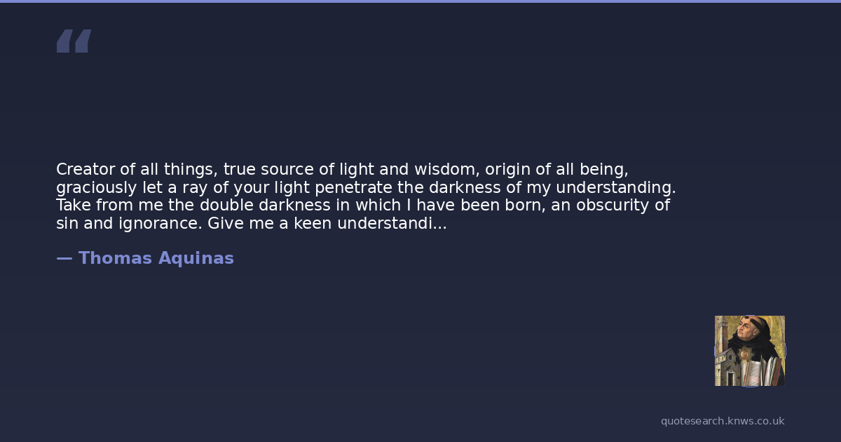 Creator of all things, true source of light and wisdom, origin of all being, graciously let a ray of your light penetrate the darkness of my understanding. Take from me the double darkness in which I have been born, an obscurity of sin and ignorance. Give me a keen understanding, a retentive memory, and the ability to grasp things correctly and fundamentally. Grant me the talent of being exact in my explanations and the ability to express myself with thoroughness and charm. Point out the beginning, direct the progress, and help in the completion.