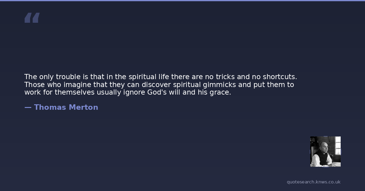 The only trouble is that in the spiritual life there are no tricks and no shortcuts. Those who imagine that they can discover spiritual gimmicks and put them to work for themselves usually ignore God's will and his grace.