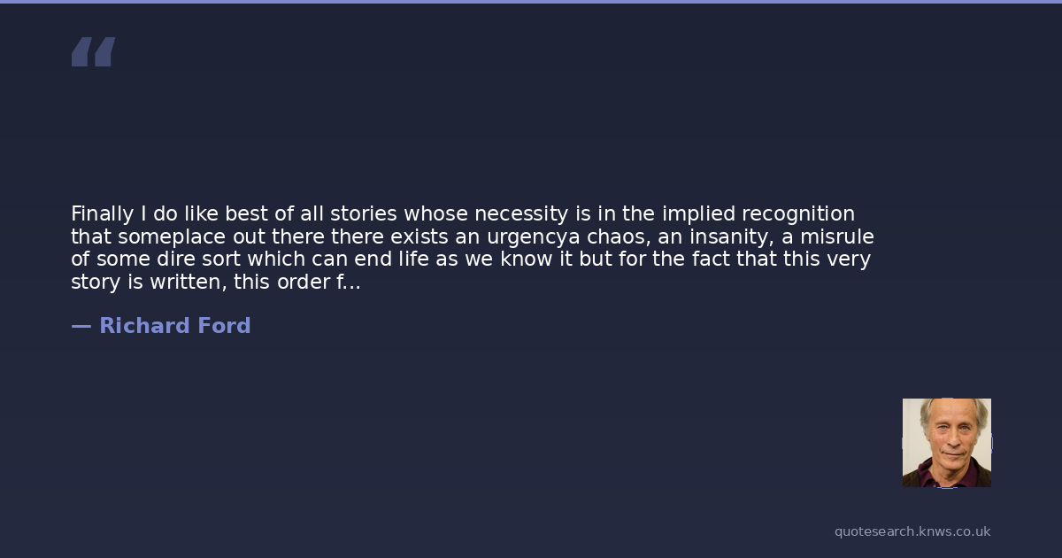 Finally I do like best of all stories whose necessity is in the implied recognition that someplace out there there exists an urgencya chaos, an insanity, a misrule of some dire sort which can end life as we know it but for the fact that this very story is written, this order found, this style determined, the worst averted, and we are beneficiaries of that order by being readers.