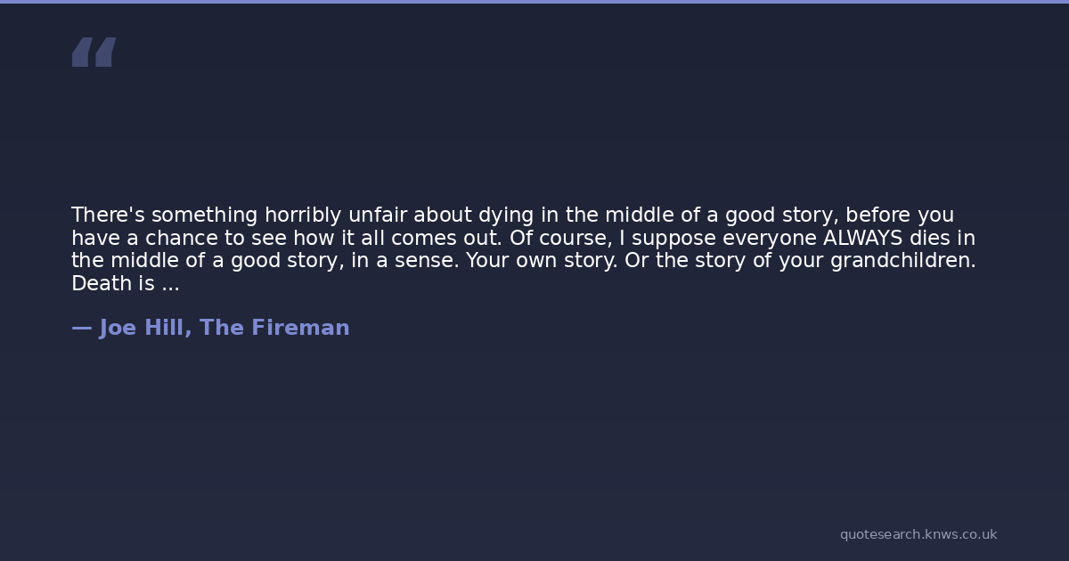 There's something horribly unfair about dying in the middle of a good story, before you have a chance to see how it all comes out. Of course, I suppose everyone ALWAYS dies in the middle of a good story, in a sense. Your own story. Or the story of your grandchildren. Death is a raw deal for narrative junkies.