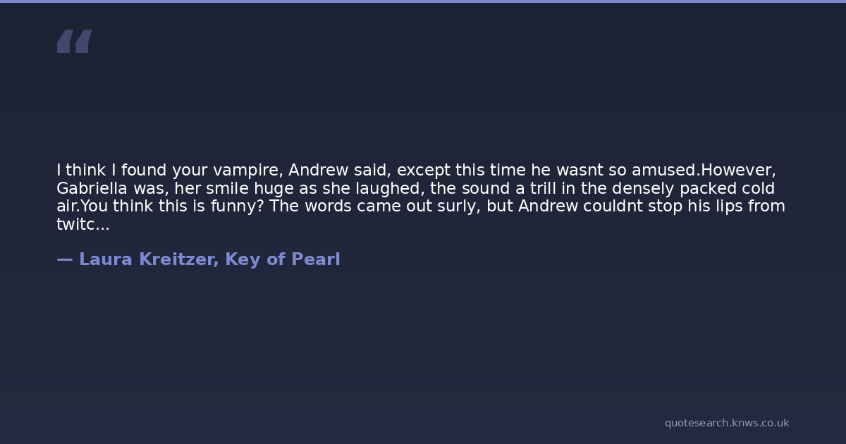 I think I found your vampire, Andrew said, except this time he wasnt so amused.However, Gabriella was, her smile huge as she laughed, the sound a trill in the densely packed cold air.You think this is funny? The words came out surly, but Andrew couldnt stop his lips from twitching over her amusement.I thought theyd be bigger, she said, stifling another round of giggles. Are you okay?Just a flesh wound.