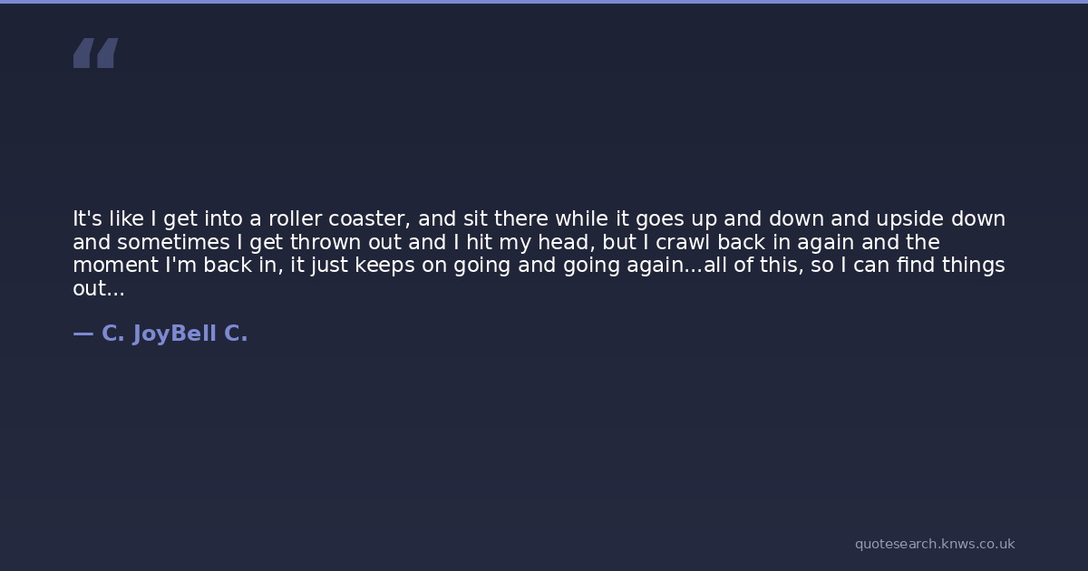 It's like I get into a roller coaster, and sit there while it goes up and down and upside down and sometimes I get thrown out and I hit my head, but I crawl back in again and the moment I'm back in, it just keeps on going and going again...all of this, so I can find things out and then I write about the things I find out so you can find them out from me. All the bruises, all the wounds, all the bumps on the head, all the scars, just so I can take that and I can write all these things, and sometimes I say "God, I don't want to be in this roller coaster anymore." But when I think about it, if I'm not right here, then where the hell would I be? On the sidewalk? I wasn't born to stand on the sidewalk, I was born to fly around crazy in the sky!