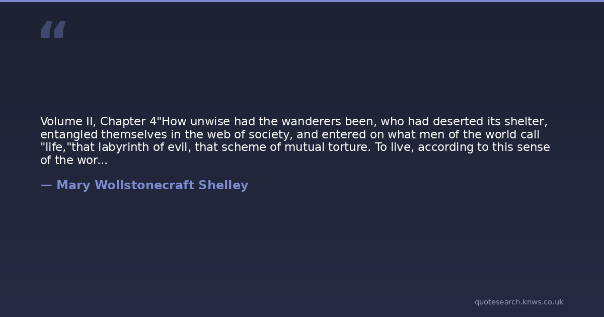 Volume II, Chapter 4"How unwise had the wanderers been, who had deserted its shelter, entangled themselves in the web of society, and entered on what men of the world call "life,"that labyrinth of evil, that scheme of mutual torture. To live, according to this sense of the word, we must not only observe and learn, we must also feel; we must not be mere spectators of action, we must act; we must not describe, but be subjects of description. Deep sorrow must have been the inmate of our bosoms; fraud must have lain in wait for us; the artful must have deceived us; sickening doubt and false hope must have chequered our days; hilarity and joy, that lap the soul in ecstasy, must at times have possessed us. Who that knows what "life" is, would pine for this feverish species of existence? I have lived. I have spent days and nights of festivity; I have joined in ambitious hopes, and exulted in victory: now,shut the door on the world, and build high the wall that is to separate me from the troubled scene enacted within its precincts. Let us live for each other and for happiness; let us seek peace in our dear home, near the inland murmur of streams, and the gracious waving of trees, the beauteous vesture of earth, and sublime pageantry of the skies. Let us leave "life," that we may live.