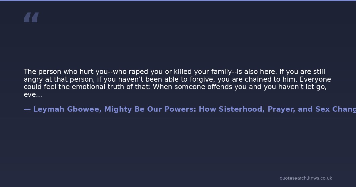 The person who hurt you--who raped you or killed your family--is also here. If you are still angry at that person, if you haven't been able to forgive, you are chained to him. Everyone could feel the emotional truth of that: When someone offends you and you haven't let go, every time you see him, you grow breathless or your heart skips a beat. If the trauma was really severe, you dream of revenge. Above you, is the Mountain of Peace and Prosperity where we all want to go. But when you try to climb that hill, the person you haven't forgiven weighs you down. It's a personal choice whether or not to let go. No one can tell you how long to mourn a death or rage over a rape. But you can't move forward until you break that chain.