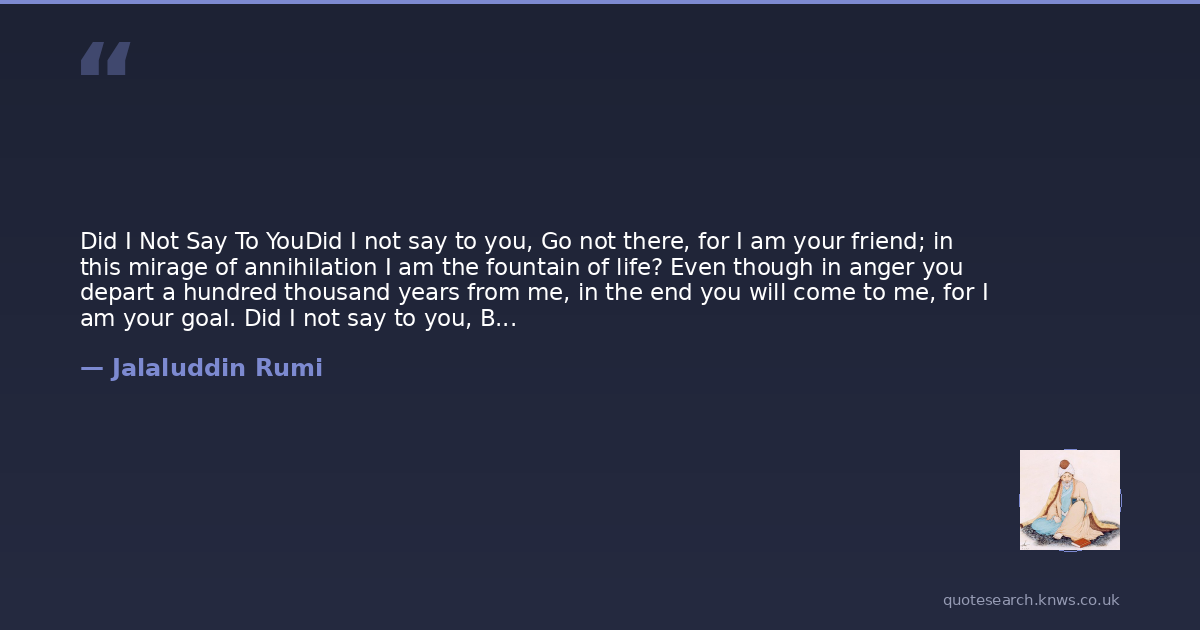 Did I Not Say To YouDid I not say to you, Go not there, for I am your friend; in this mirage of annihilation I am the fountain of life? Even though in anger you depart a hundred thousand years from me, in the end you will come to me, for I am your goal. Did I not say to you, Be not content with worldly forms, for I am the fashioner of the tabernacle of your contentment? Did I not say to you, I am the sea and you are a single fish; go not to dry land, for I am your crystal sea? Did I not say to you, Go not like birds to the snare; come, for I am the power of flight and your wings and feet? Did I not say to you, They will waylay you and make you cold, for I am the fire and warmth and heat of your desire? Did I not say to you, They will implant in you ugly qualities so that you will forget that I am the source of purity to you? Did I not say to you, Do not say from what direction the ser- vants affairs come into order? I am the Creator without directions. If you are the lamp of the heart, know where the road is to the house; and if you are godlike of attribute, know that I am your Maser.