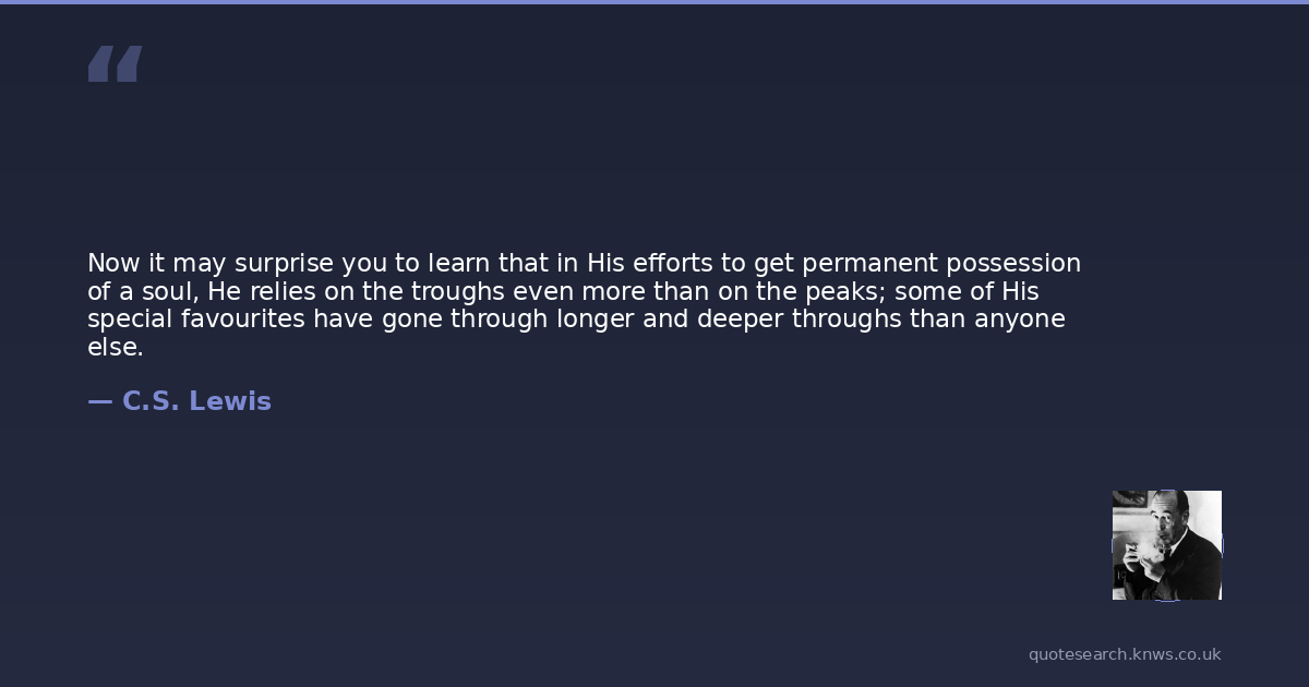 Now it may surprise you to learn that in His efforts to get permanent possession of a soul, He relies on the troughs even more than on the peaks; some of His special favourites have gone through longer and deeper throughs than anyone else.