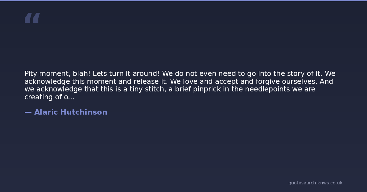 Pity moment, blah! Lets turn it around! We do not even need to go into the story of it. We acknowledge this moment and release it. We love and accept and forgive ourselves. And we acknowledge that this is a tiny stitch, a brief pinprick in the needlepoints we are creating of our lives. And we also acknowledge that this lifetime of ours is but a tiny little stitch in the ever-expanding, infinite needlepoint of the Universe. Self-pity is not a reason good enough for us to be out of alignment with peace.