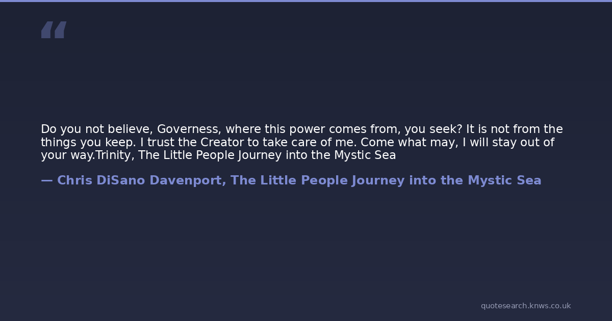 Do you not believe, Governess, where this power comes from, you seek? It is not from the things you keep. I trust the Creator to take care of me. Come what may, I will stay out of your way.Trinity, The Little People Journey into the Mystic Sea