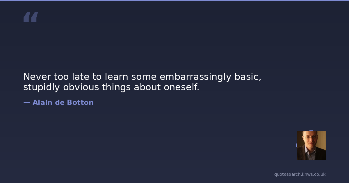 Alain de Botton was a contemporary British author. Alain de Botton is a Swiss-born British author and public speaker. His books discuss various contemporary subjects and themes, emphasizing philosophy's relevance to everyday life. Read more on Wikipedia →