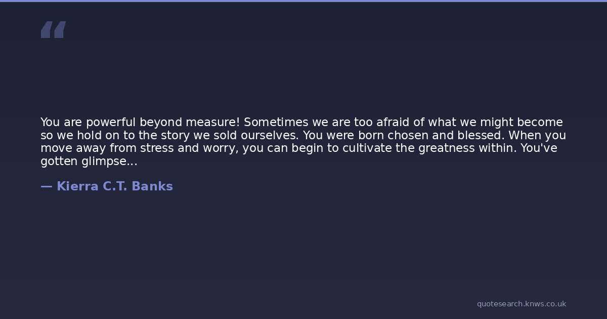 You are powerful beyond measure! Sometimes we are too afraid of what we might become so we hold on to the story we sold ourselves. You were born chosen and blessed. When you move away from stress and worry, you can begin to cultivate the greatness within. You've gotten glimpses of what you can be because of the hand of God on your life. Let's move from sickness to success. Rewrite your story and you win!!!!