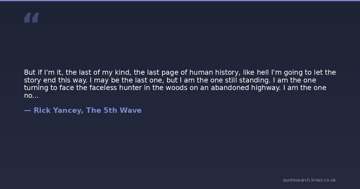 But if I'm it, the last of my kind, the last page of human history, like hell I'm going to let the story end this way. I may be the last one, but I am the one still standing. I am the one turning to face the faceless hunter in the woods on an abandoned highway. I am the one not running but facing. Because if I am the last one, then I am humanity. And if this is humanity's last war, then I am the battlefield.