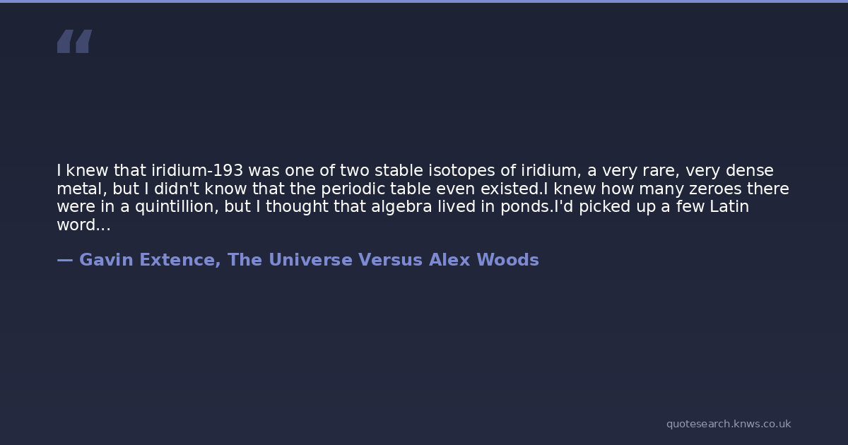 I knew that iridium-193 was one of two stable isotopes of iridium, a very rare, very dense metal, but I didn't know that the periodic table even existed.I knew how many zeroes there were in a quintillion, but I thought that algebra lived in ponds.I'd picked up a few Latin words, and a smattering of Elvish, but my French was non-existent.I'd read more than one book of more than one thousand pages (more than once), but I wouldn't have been able to identify a metaphor if it poked me in the eye.By secondary-school standards, I was quite a dunce.