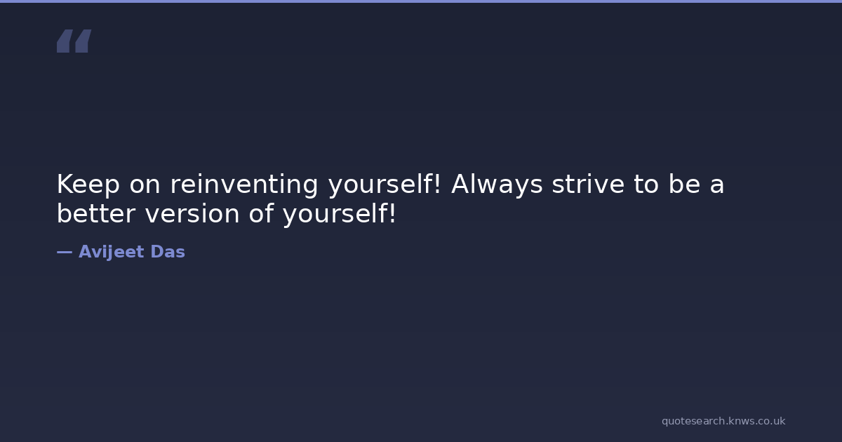 Keep on reinventing yourself! Always strive to be a better version of yourself! better-you inspiring-quotes inspiring-thoughts life-lessons life-quotes-and-sayings meaning-of-life-quotes reinventing-yourself struggle-strength-character struggles-quotes work-hard Download Image Share on X Share on Facebook Copy Link