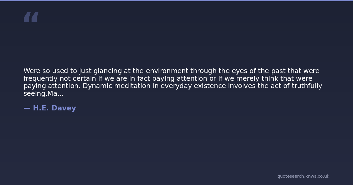 Were so used to just glancing at the environment through the eyes of the past that were frequently not certain if we are in fact paying attention or if we merely think that were paying attention. Dynamic meditation in everyday existence involves the act of truthfully seeing.Many of us have changed some aspect of our appearance only to have this go unnoticed by friends. Perhaps youve shaved off a mustache, added a tattoo, or altered your hairstyle, but your acquaintances failed to initially notice. In such a case, your friends were looking at their environment through the eyes of the past instead of actually seeing what was taking place in the present.