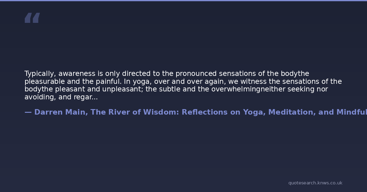 Typically, awareness is only directed to the pronounced sensations of the bodythe pleasurable and the painful. In yoga, over and over again, we witness the sensations of the bodythe pleasant and unpleasant; the subtle and the overwhelmingneither seeking nor avoiding, and regarding all equally and without prejudice. It is through this nonjudgmental observation of sensation that the wisdom of the body is received, true healing is achieved, and the door to the unconscious mind is cast open.