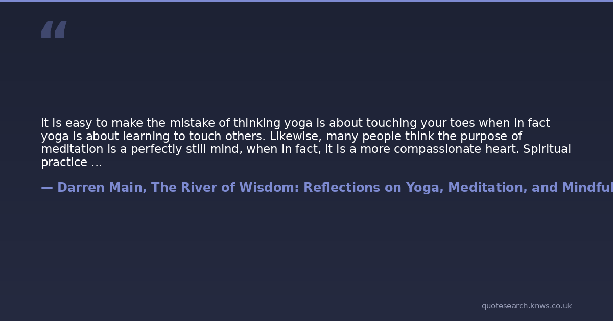 It is easy to make the mistake of thinking yoga is about touching your toes when in fact yoga is about learning to touch others. Likewise, many people think the purpose of meditation is a perfectly still mind, when in fact, it is a more compassionate heart. Spiritual practice is measured by ones ability to ease the suffering of the world one breath at a time.