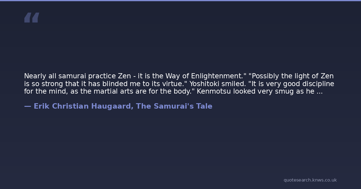Nearly all samurai practice Zen - it is the Way of Enlightenment." "Possibly the light of Zen is so strong that it has blinded me to its virtue." Yoshitoki smiled. "It is very good discipline for the mind, as the martial arts are for the body." Kenmotsu looked very smug as he said this. "I do Zazen twice a week." "I think it will do no-one any harm, though personally I find it more pleasant to think than to empty my mind of thought.