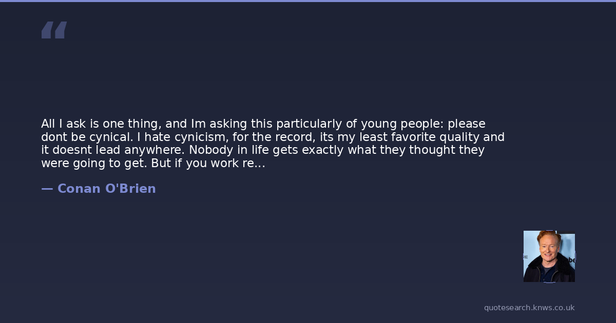All I ask is one thing, and Im asking this particularly of young people: please dont be cynical. I hate cynicism, for the record, its my least favorite quality and it doesnt lead anywhere. Nobody in life gets exactly what they thought they were going to get. But if you work really hard and youre kind, amazing things will happen.
