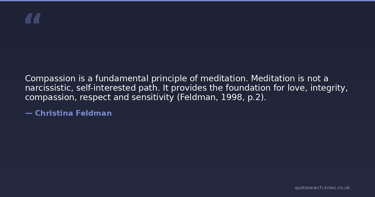 Compassion is a fundamental principle of meditation. Meditation is not a narcissistic, self-interested path. It provides the foundation for love, integrity, compassion, respect and sensitivity (Feldman, 1998, p.2).