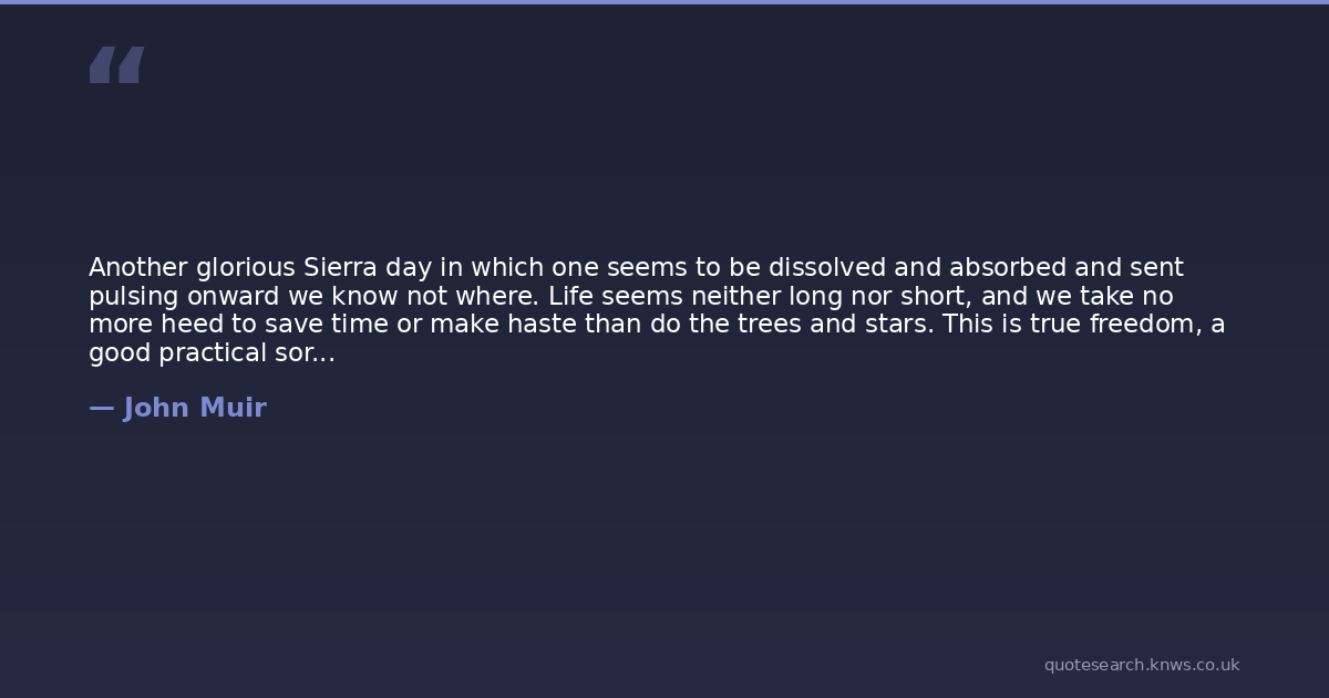 Another glorious Sierra day in which one seems to be dissolved and absorbed and sent pulsing onward we know not where. Life seems neither long nor short, and we take no more heed to save time or make haste than do the trees and stars. This is true freedom, a good practical sort of immortality.