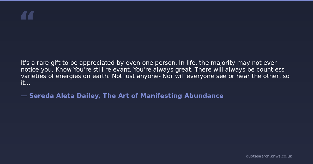 It's a rare gift to be appreciated by even one person. In life, the majority may not ever notice you. Know You're still relevant. You're always great. There will always be countless varieties of energies on earth. Not just anyone- Nor will everyone see or hear the other, so its not at all personal. Nor is it even necessary for the majority to see you. Find time to appreciate and see yourself. Inside you will find your strength. It's in there. Stay true, Stay encouraged! If one person can make it then so can you. Oneness is what you are. If one gets there we all do. Say it again and again! Let the words echo throughout your being. Stay true to your dreams.