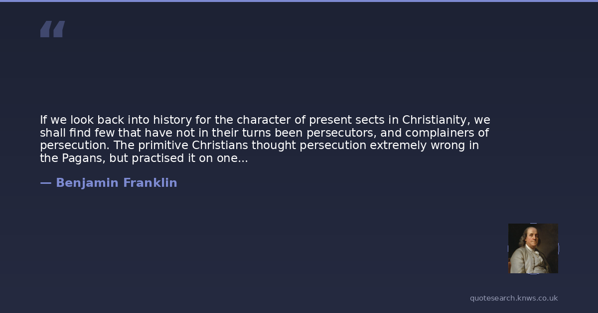 If we look back into history for the character of present sects in Christianity, we shall find few that have not in their turns been persecutors, and complainers of persecution. The primitive Christians thought persecution extremely wrong in the Pagans, but practised it on one another. The first Protestants of the Church of England, blamed persecution in the Roman church, but practised it against the Puritans: these found it wrong in the Bishops, but fell into the same practice themselves both here and in New En