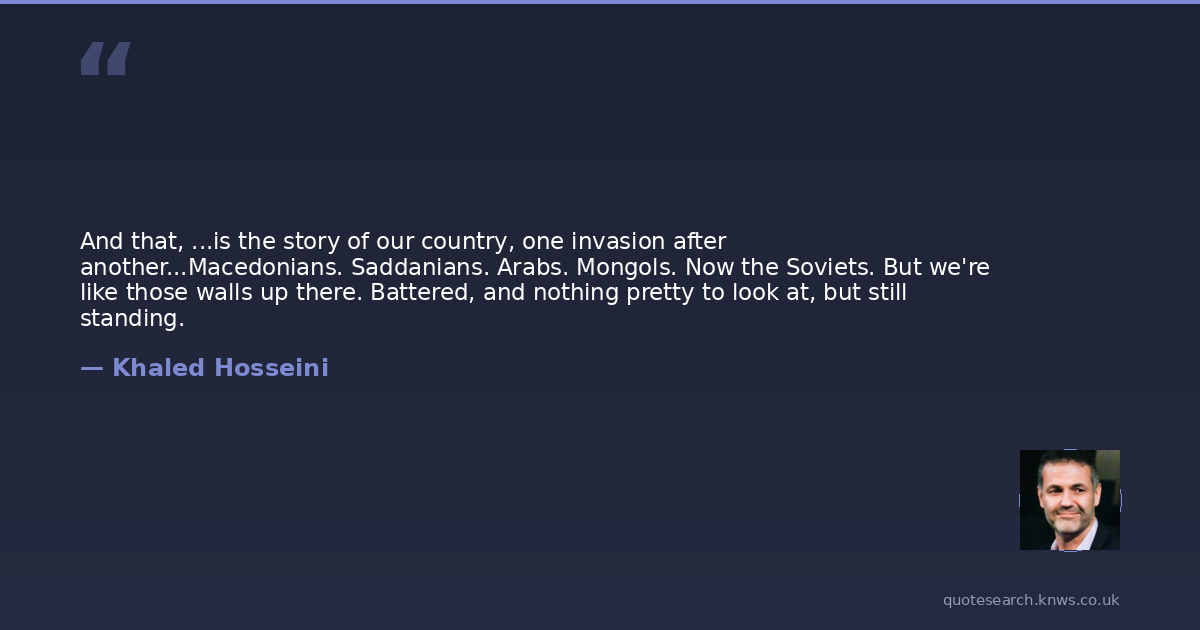 And that, ...is the story of our country, one invasion after another...Macedonians. Saddanians. Arabs. Mongols. Now the Soviets. But we're like those walls up there. Battered, and nothing pretty to look at, but still standing.