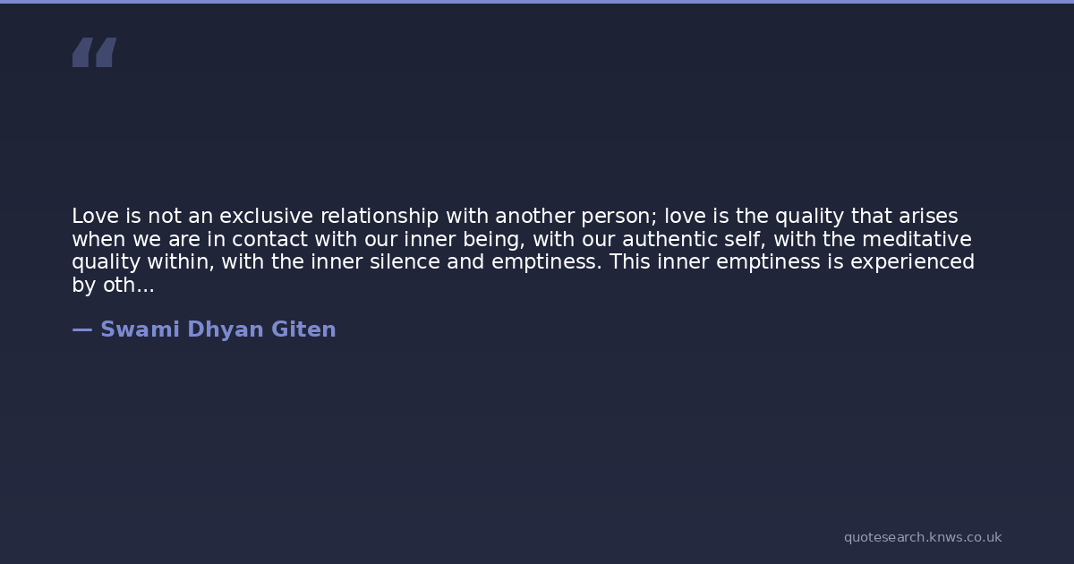 Love is not an exclusive relationship with another person; love is the quality that arises when we are in contact with our inner being, with our authentic self, with the meditative quality within, with the inner silence and emptiness. This inner emptiness is experienced by others and is expressed on the outside as love. This love is not addressed to a specific person; it is a presence and quality that surrounds a person like a fragrance.