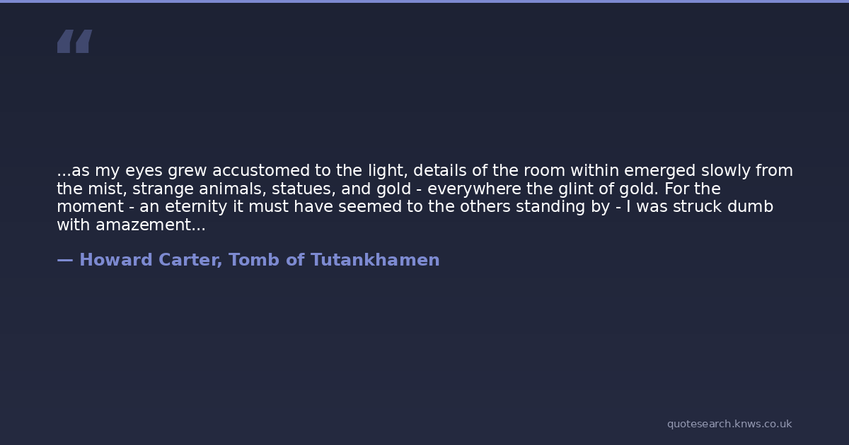 ...as my eyes grew accustomed to the light, details of the room within emerged slowly from the mist, strange animals, statues, and gold - everywhere the glint of gold. For the moment - an eternity it must have seemed to the others standing by - I was struck dumb with amazement, and when Lord Carnarvon, unable to stand the suspense any longer, inquired anxiously, 'Can you see anything?' it was all I could do to get out the words, 'Yes, wonderful things.