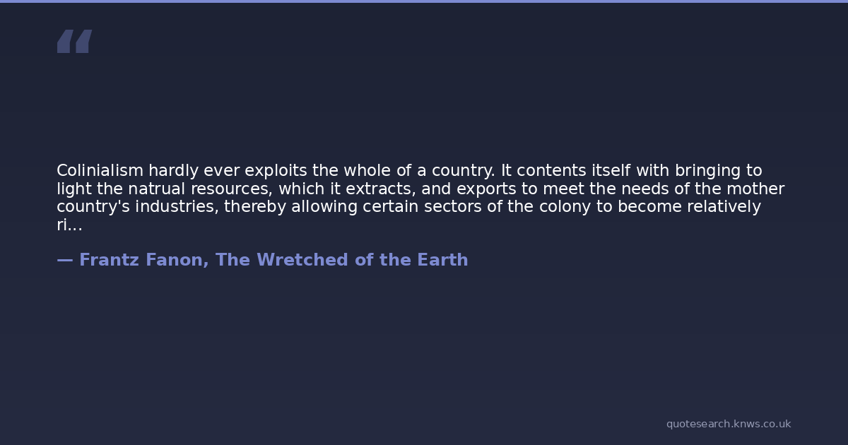 Colinialism hardly ever exploits the whole of a country. It contents itself with bringing to light the natrual resources, which it extracts, and exports to meet the needs of the mother country's industries, thereby allowing certain sectors of the colony to become relatively rich. But the rest of the colony follows its path of under-development and poverty, or at all events sinks into it more deeply.