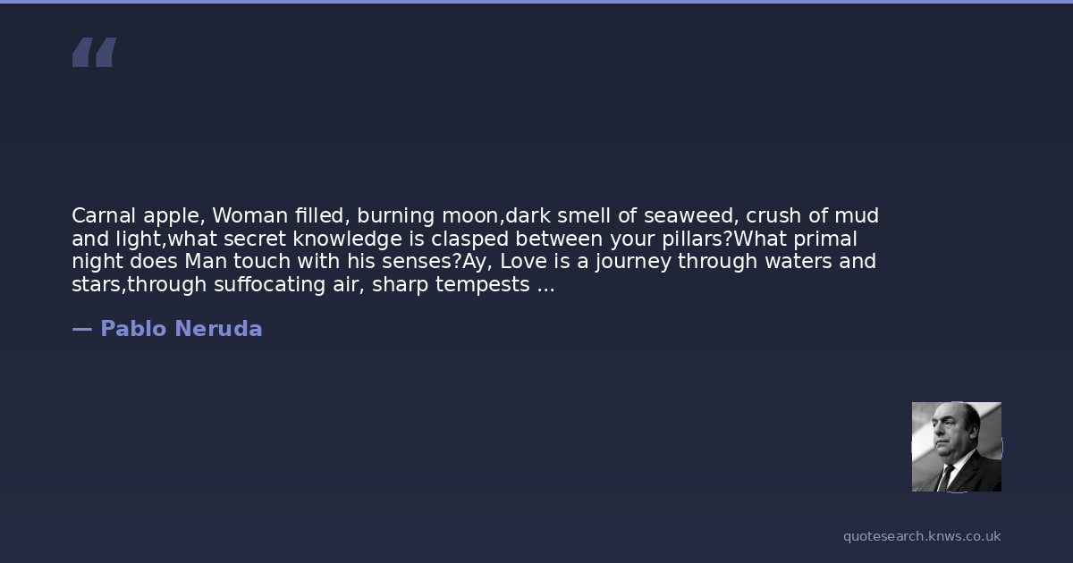 Carnal apple, Woman filled, burning moon,dark smell of seaweed, crush of mud and light,what secret knowledge is clasped between your pillars?What primal night does Man touch with his senses?Ay, Love is a journey through waters and stars,through suffocating air, sharp tempests of grain:Love is a war of lightning,and two bodies ruined by a single sweetness.Kiss by kiss I cover your tiny infinity,your margins, your rivers, your diminutive villages,and a genital fire, transformed by delight,slips through the narrow channels of bloodto precipitate a nocturnal carnation,to be, and be nothing but light in the dark.
