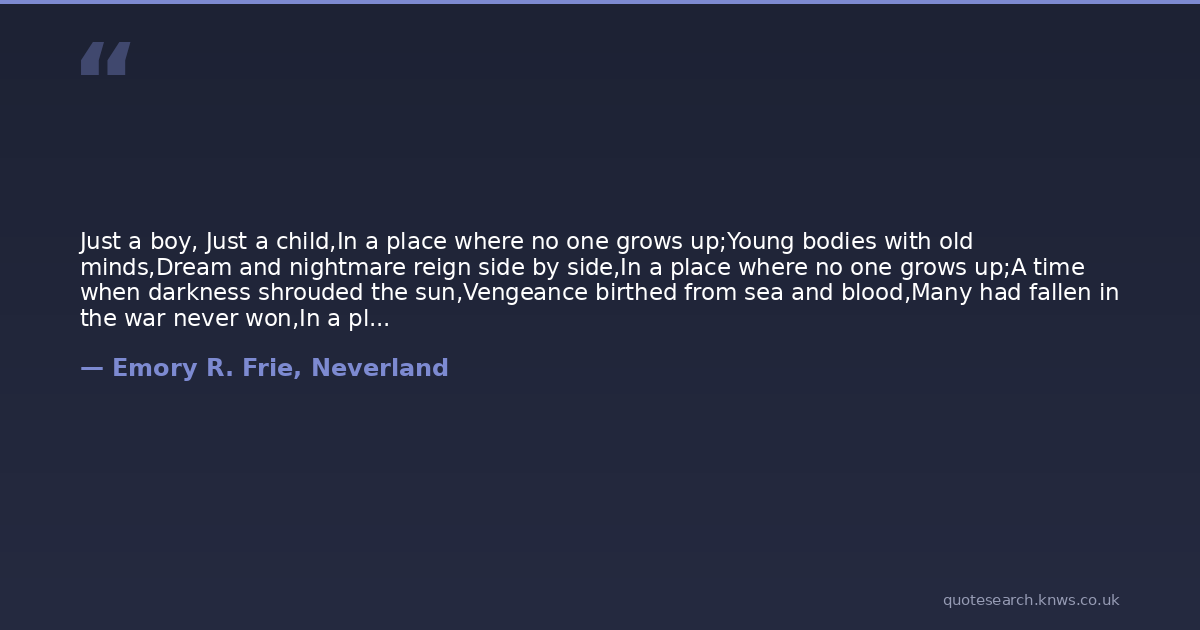 Just a boy, Just a child,In a place where no one grows up;Young bodies with old minds,Dream and nightmare reign side by side,In a place where no one grows up;A time when darkness shrouded the sun,Vengeance birthed from sea and blood,Many had fallen in the war never won,In a place where no one grows up;When the boys heart grieved he became more of a man,When the pirates heart hardened with the loss of his hand,One dreadful night everything changed and feuds began,Now the ghosts from their mistakes are tied to this land,In a place where no one grows up;Just a boy, just a child, in appearance its true,But children can carry terrible burdens too,For sometimes stopping time doesnt mean forever youth,Living, forgetting, loving, seething, bearing an all too heavy truth;Just a boy, Just a child,In a place where no one grows up.