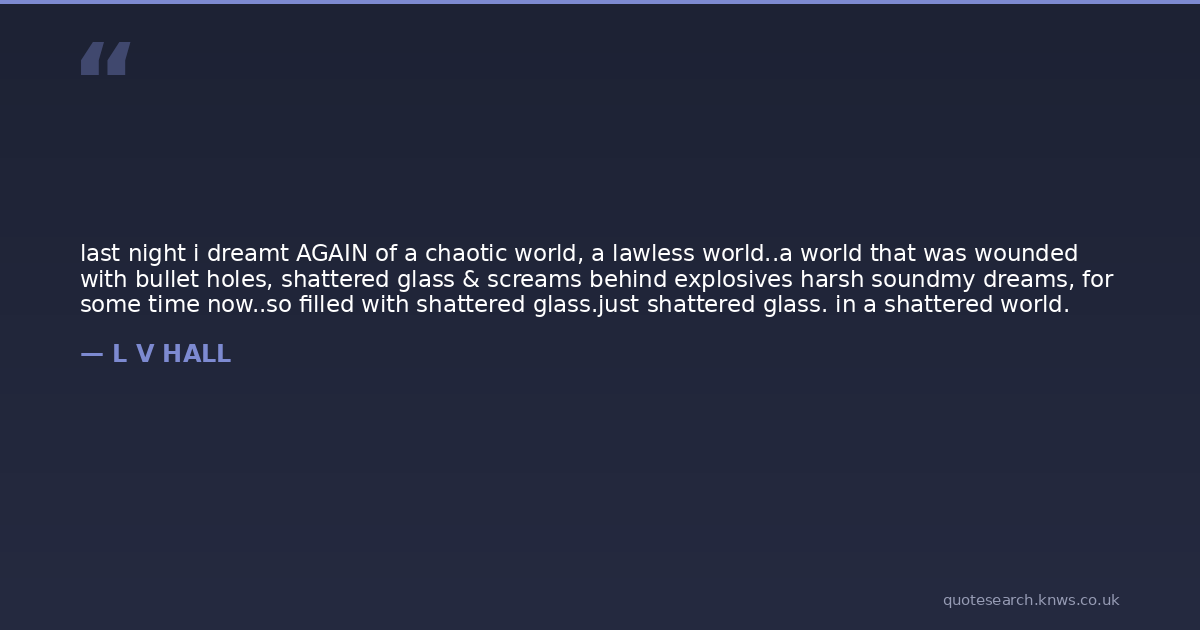 last night i dreamt AGAIN of a chaotic world, a lawless world..a world that was wounded with bullet holes, shattered glass & screams behind explosives harsh soundmy dreams, for some time now..so filled with shattered glass.just shattered glass. in a shattered world.