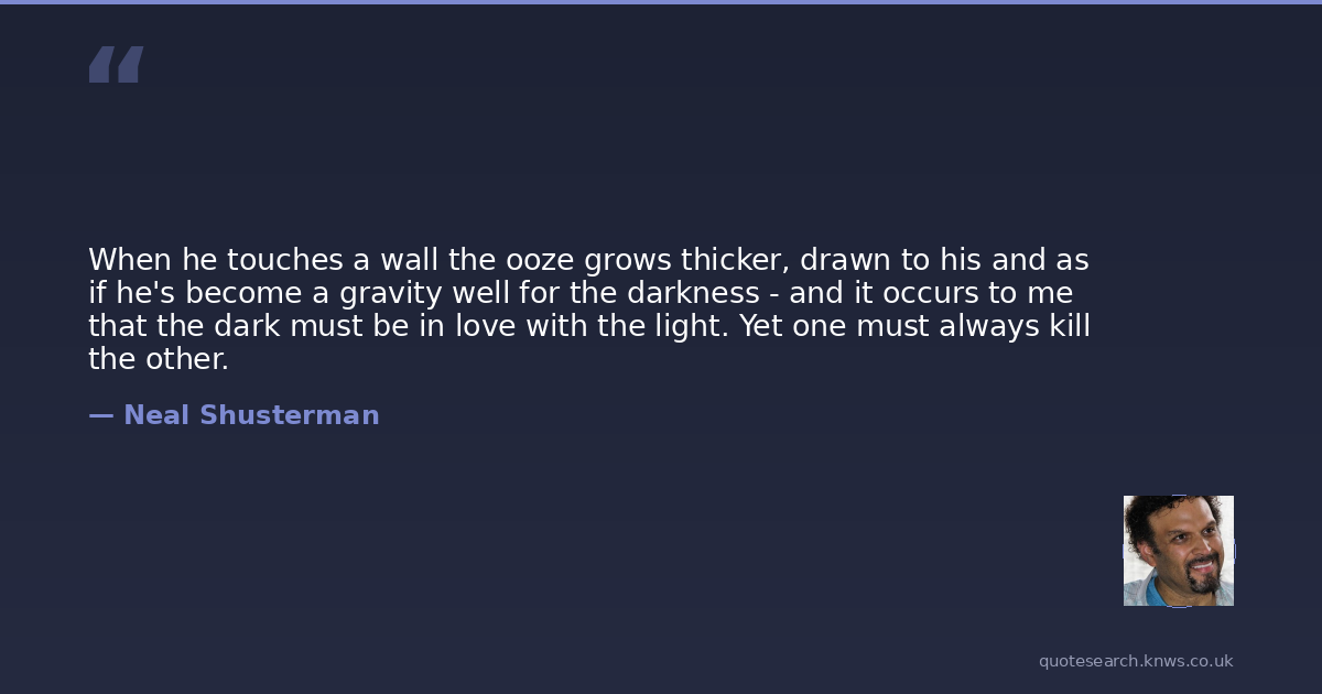 When he touches a wall the ooze grows thicker, drawn to his and as if he's become a gravity well for the darkness - and it occurs to me that the dark must be in love with the light. Yet one must always kill the other.