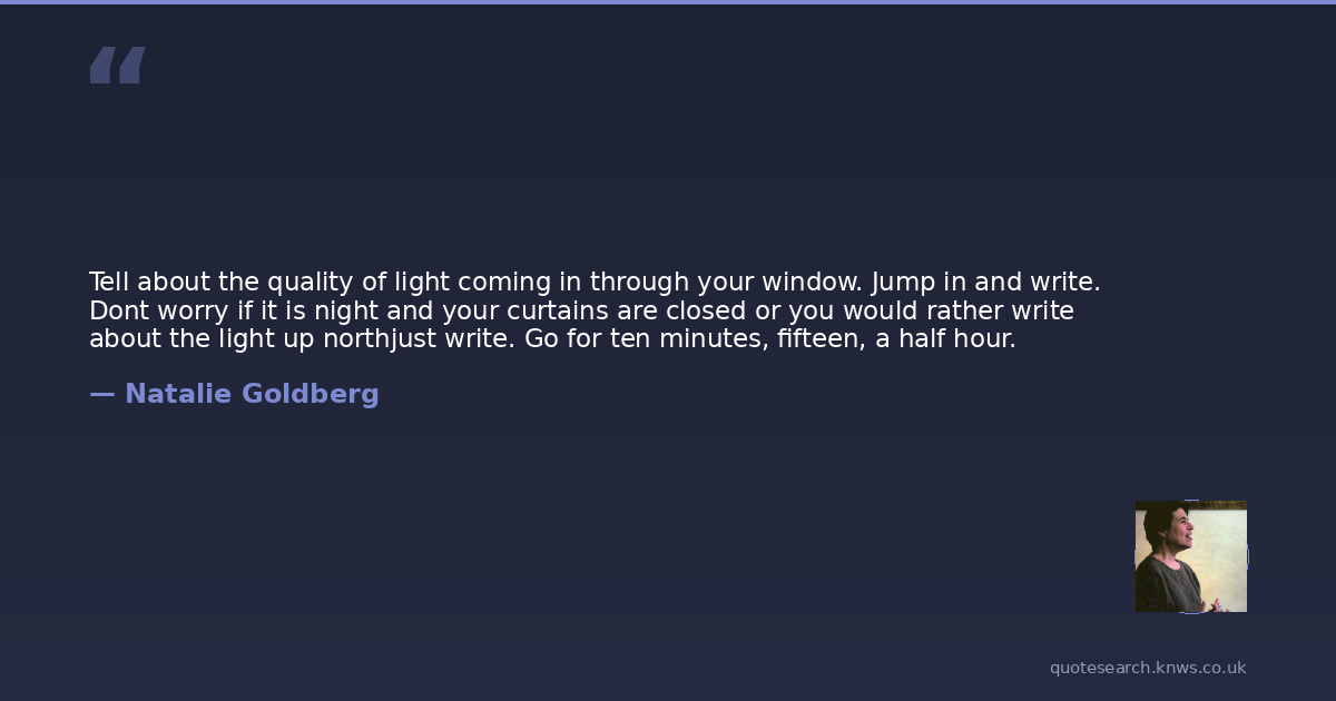 Tell about the quality of light coming in through your window. Jump in and write. Dont worry if it is night and your curtains are closed or you would rather write about the light up northjust write. Go for ten minutes, fifteen, a half hour.