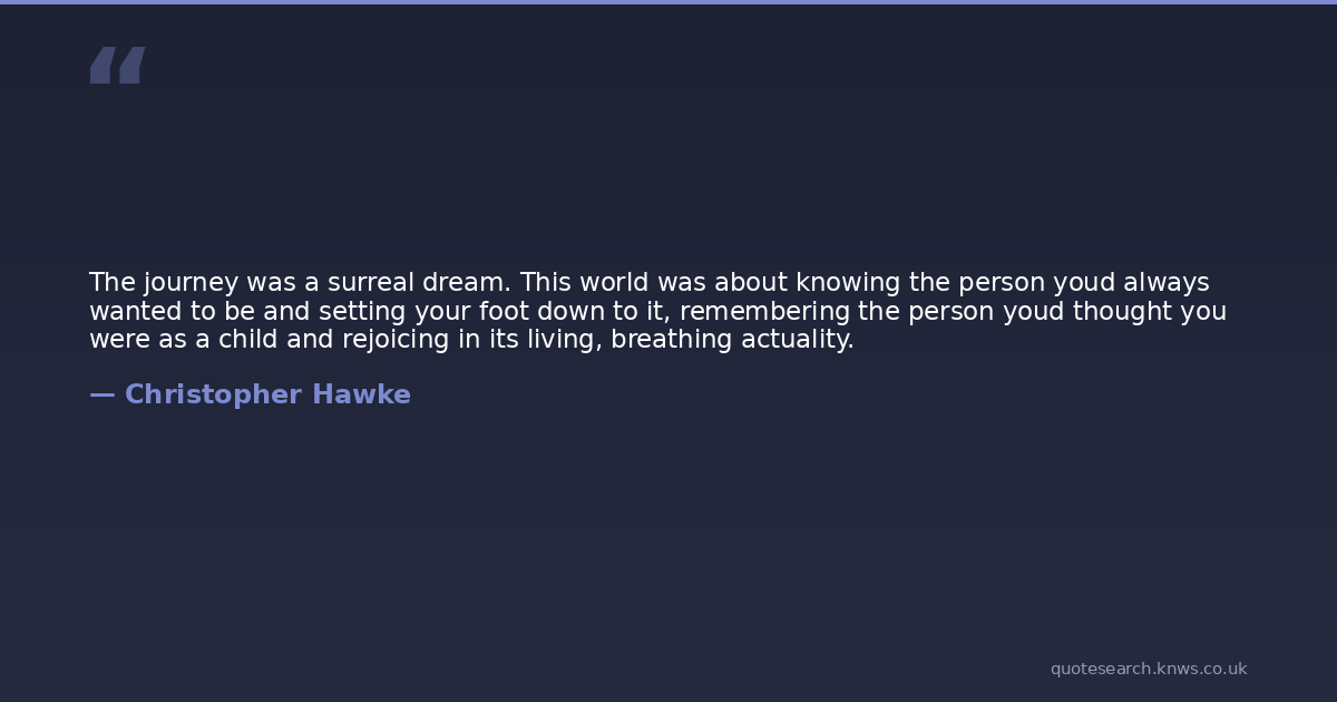 The journey was a surreal dream. This world was about knowing the person youd always wanted to be and setting your foot down to it, remembering the person youd thought you were as a child and rejoicing in its living, breathing actuality.