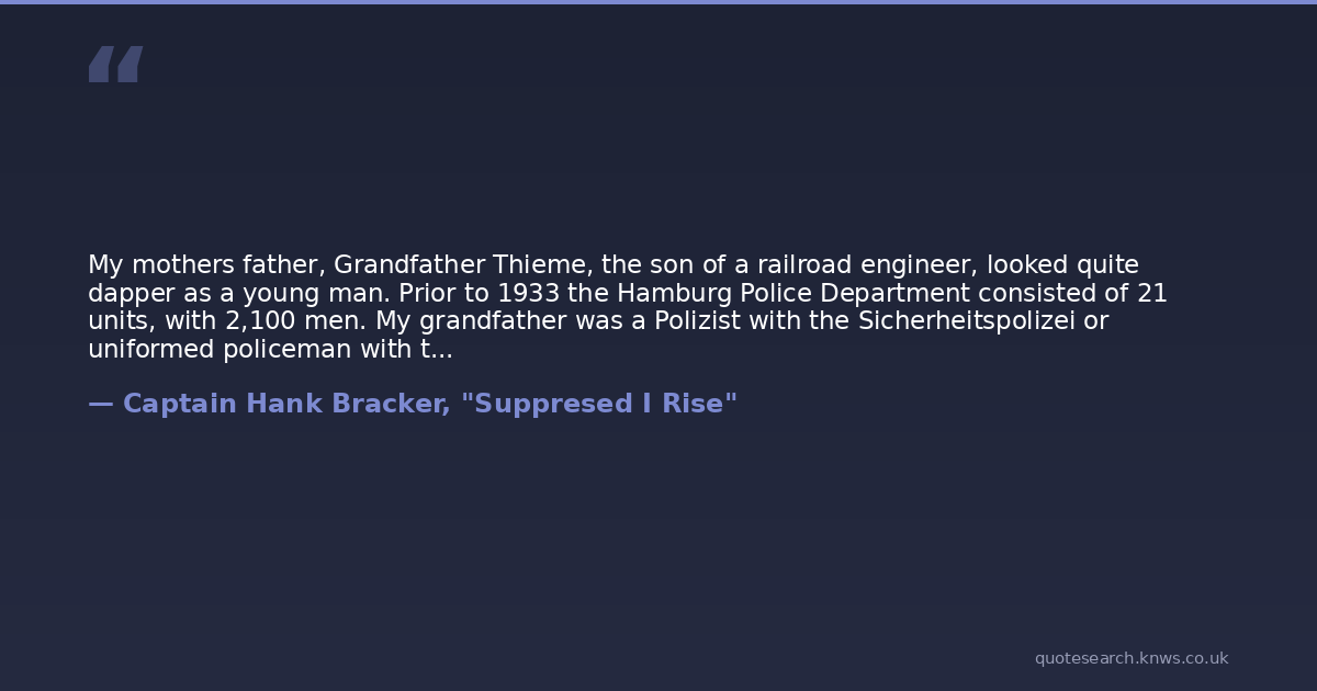 My mothers father, Grandfather Thieme, the son of a railroad engineer, looked quite dapper as a young man. Prior to 1933 the Hamburg Police Department consisted of 21 units, with 2,100 men. My grandfather was a Polizist with the Sicherheitspolizei or uniformed policeman with the department. Later, with an expansion of the Hamburg Police Department to 5,500 men and the formation of an investigative branch, he was promoted to the esteemed position of a Kriminalbeamte inspector. He rose to the rank of Chief of Detectives, and had a reputation of being tough, and not someone you could mess with. Having a baldhead and the general appearance of Telly Savalas, the late Hollywood movie actor, I dont think anyone did. An action story and part of my grandfathers legacy was when he chased a felon across the rooftops of prewar Hamburg, firing his Dienstpistole, service revolver, as he made his way from one steep inclined slate roof to the next.Of course, Grandpa got his man! Even with this factual tidbit, there isnt all that much I know about him, other than that, at the then ripe old age of sixty-four, he peacefully died in his chair while reading the evening newspaper.