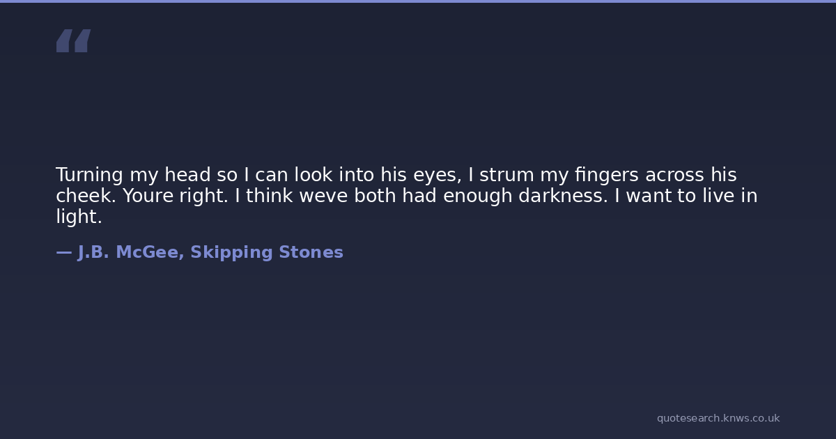 Turning my head so I can look into his eyes, I strum my fingers across his cheek. Youre right. I think weve both had enough darkness. I want to live in light.
