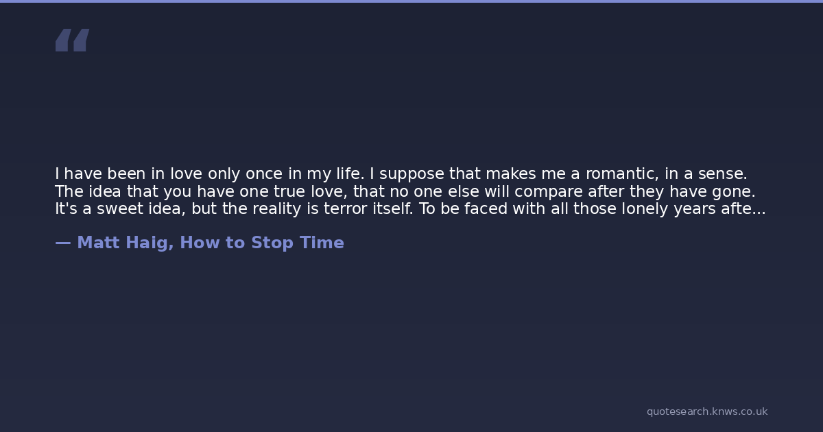 I have been in love only once in my life. I suppose that makes me a romantic, in a sense. The idea that you have one true love, that no one else will compare after they have gone. It's a sweet idea, but the reality is terror itself. To be faced with all those lonely years after. To exist when the point of you has gone.